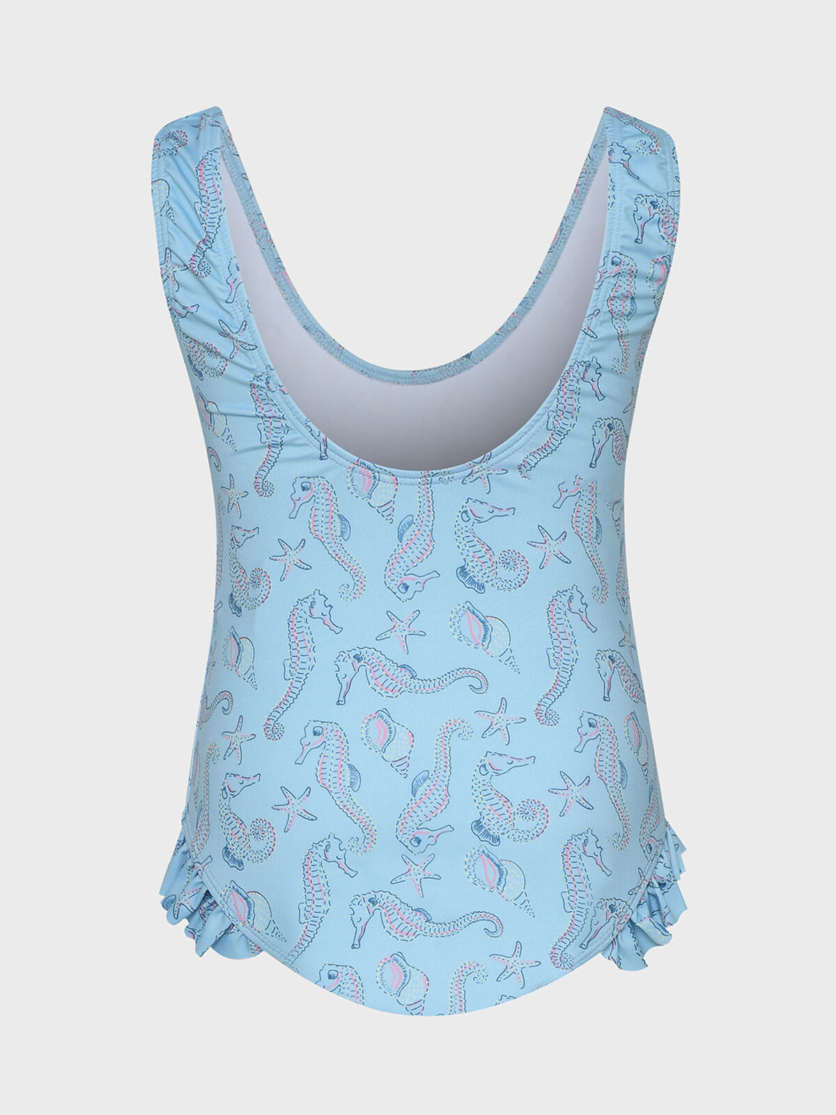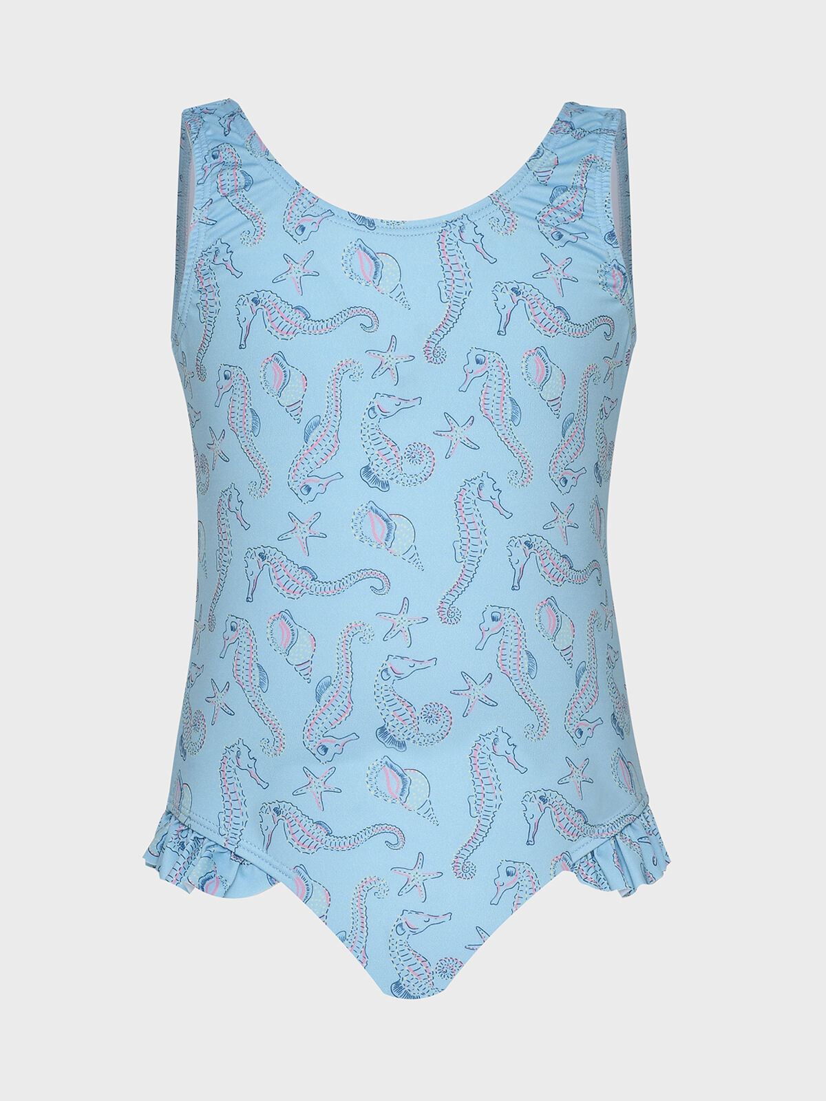 Как подводная сказка, этот купальник украшен милыми морскими коньками — будто герои из мультфильма, всплывшие из морских глубин. Голубой цвет — чистый, как летнее небо, ткань эластичная и приятная к телу, подходит для активных игр в воде. Не сковывает движений, быстро сохнет. Для тех, кто превращает пляж в коралловый риф и готов нырять за сокровищами русалок.