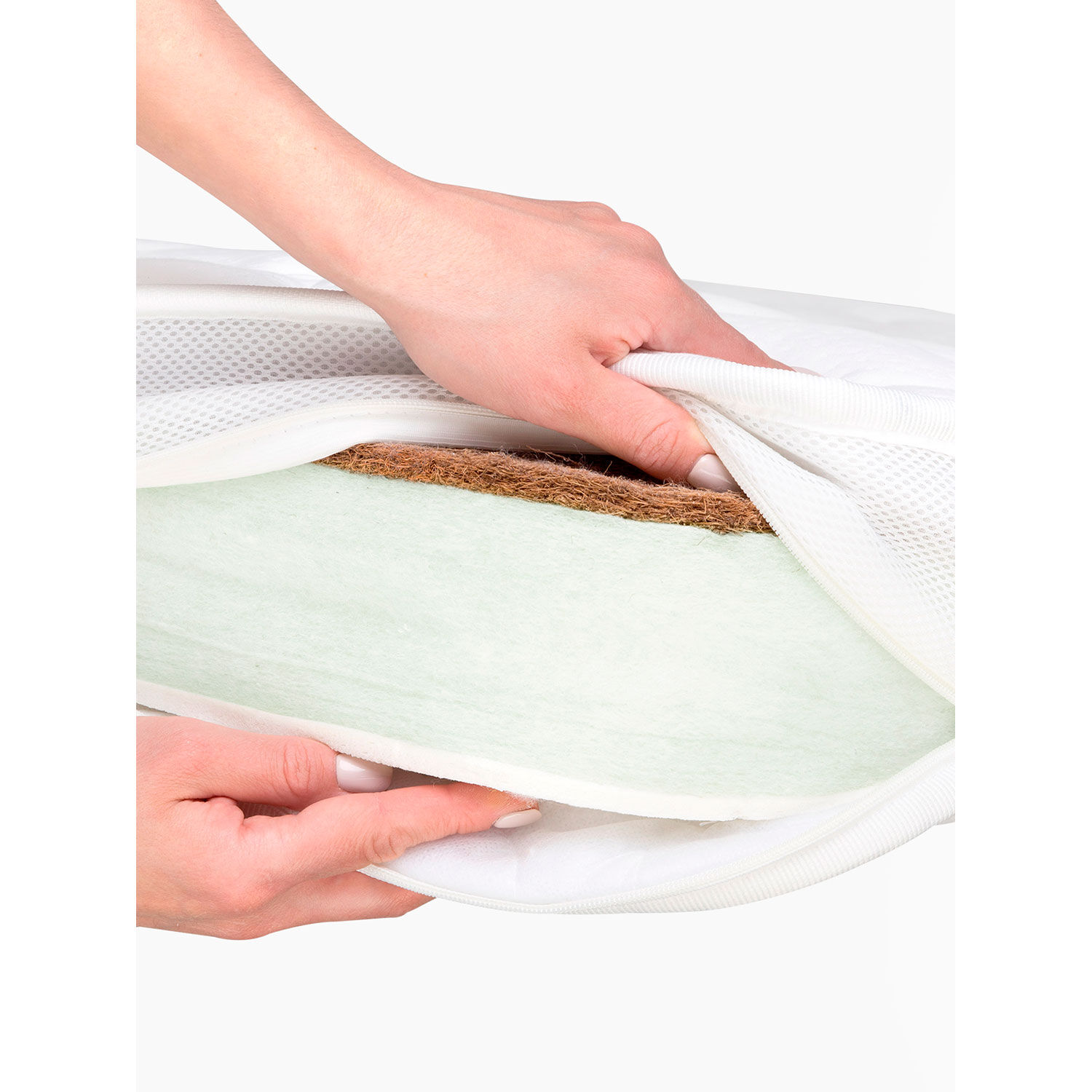 наполнитель - кокосовая койра, нетканный материал Hollcon Eucalypt (70% полиэстер, 30% эвкалиптовые волокна), латекс, нетканый материал Airotek, съемный чехол - трикотаж StressFree (верхний слой 100% хлопок, нижний слой 100% полиэстер)